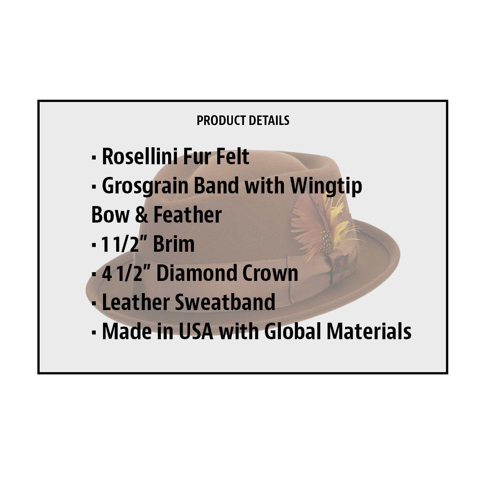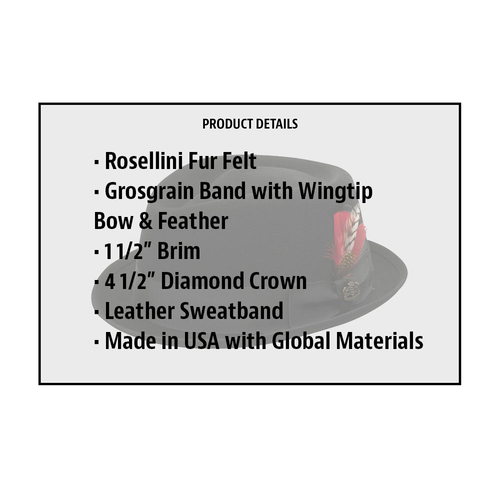 A slightly smaller-brimmed hat, this Biltmore L.A. fedora is aptly named for a city known for its drama, dress, passion and unique flair. The fur felt blend will have you ready for your next adventure in no time. The Rosellini Finish is extra smooth with a soft supple feel.